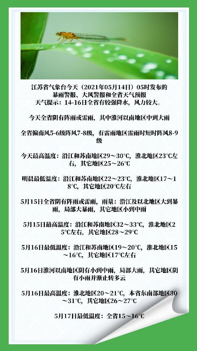 【暴雨警报 大风警报】5月14日全省阴有阵雨或雷雨,其中淮河以南地区中到大雨,全省偏南风5-6级阵风7-8级,有雷雨地区雷雨时短时阵风8-9级,14日最高温度:沿江和苏南地区29~30℃,淮北地区23℃左右,其它地区25~26℃,15日早晨最低温度:沿江和苏南地区22~23℃,淮北地区17~18℃,其它地区20℃左右。