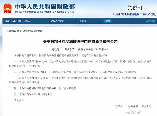 据财政部网站5月14日消息,财政部、海关总署、税务总局联合发布《关于对部分成品油征收进口环节消费税的公告》称,为维护公平税收秩序,根据国内成品油消费税政策相关规定,现将有关问题公告如下: