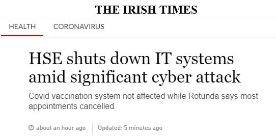 据《爱尔兰时报》、路透社报道,当地时间14日,爱尔兰卫生健康服务署(HSE)网络信息系统受到严重的“勒索软件攻击”,爱尔兰卫生健康服务署随即表示关闭所有的网络信息系统,以避免攻击并评估当前安全形势。