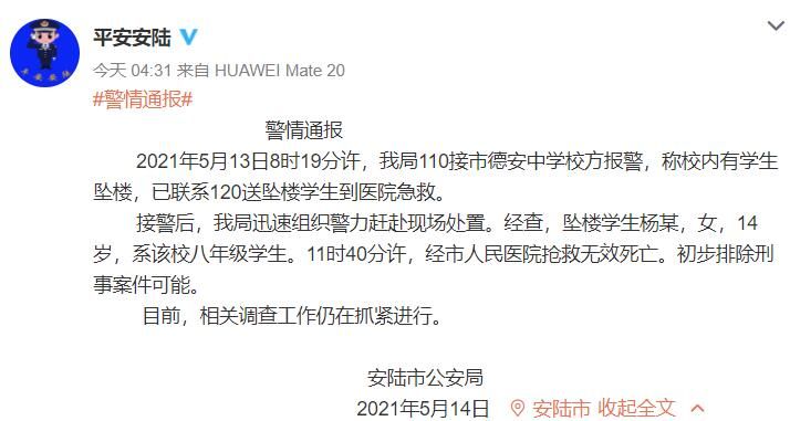 2021年5月13日8时19分许,我局110接市德安中学校方报警,称校内有学生坠楼,已联系120送坠楼学生到医院急救。
