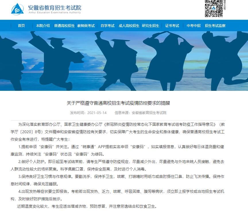 荔枝新闻讯 5月14日,安徽省教育招生考试院发出《关于严格遵守普通高校招生考试疫情防控要求的提醒》。
