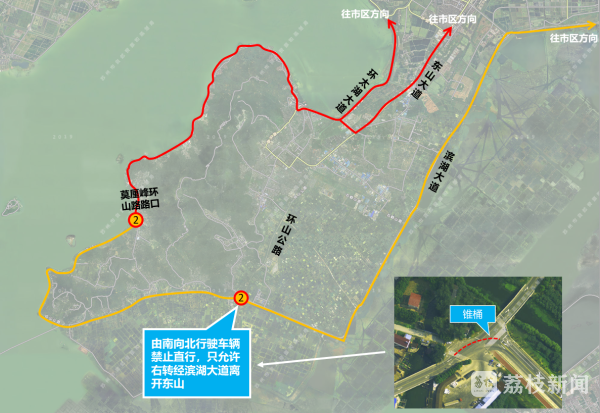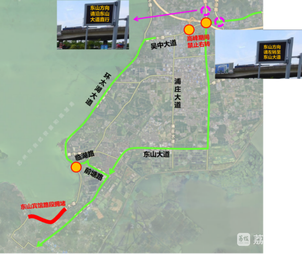 2.出东山避开环太湖大道拥堵,东山北部车辆由环湖路绕行至浦庄大道及东山大道;东山南部车辆由滨湖大道绕行至东山大道。交警会在滨湖大道-环山公路路口设置警力和锥桶,引导车辆由滨湖大道绕行出东山。