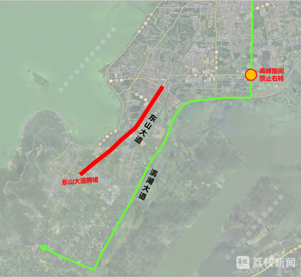 环太湖大道全线拥堵后,吴中大道-东山互通及吴中大道东山大道交叉口禁止车辆右转,全部车辆由东山大道绕行。