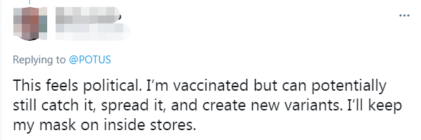 仅从上述留言中便不难看出,尽管被疫情“教训”了一年多并付出惨重代价,“戴不戴口罩”在美国仍是个容易引发争议的话题,它象征着美国各界在应对疫情的方法上存在的分歧,也是政治分野的标志。就像一位网友所说:“感觉(CDC的指南)太政治化了。我打疫苗了,但我仍可能被感染并传播病毒,我会一直戴口罩。”