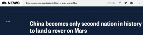 美国全国广播公司(NBC)发表一篇名为“中国成为历史上第二个(成功)在火星上着陆探测器的国家”评论文章,表示“祝融号”火星车着陆是中国国家航天局的一个重要里程碑,中国国家航天局在短短几十年内取得了快速发展。↓