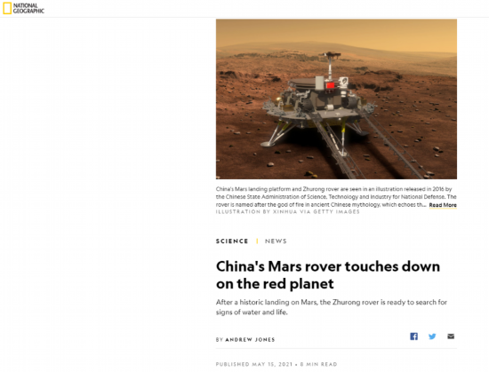 “此次着陆使得中国成为历史上第二个在火星表面(成功)着陆探测器的国家。”美国《国家地理》杂志网站评价说,在火星表面成功着陆是一项非凡的挑战。今日之前,只有美国国家航空航天局(NASA)在火星表面安全着陆并操作航天器。1971年,苏联“火星3号”探测器着陆舱仅工作了22秒钟便与地球失去联系。报道继续说,通过在火星上着陆和漫游,中国在太空领域超越了许多同行。↓