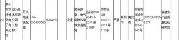 抽检结果显示,这款华为技术有限公司(标称)生产的开关电源适配器规格型号为HW-050450C00,商标显示HUAWEI,不合格项目为爬电距离、电气间隙和绝缘穿透距离,不合格程度为:严重。承检机构为福建省产品质量检验研究院。