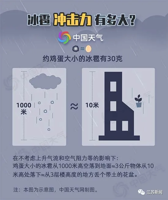 根据能量守恒定律,当它从1000米高空落到地面时,相当于3公斤物体从10米左右高度下落,也就差不多等于从3层楼高地方丢个带土的花盆,砸向人或车……这只是一个冰雹,如果我们在户外遭遇冰雹,可能是若干个“花盆”从天而降。所以遭遇冰雹,切不可掉以轻心。