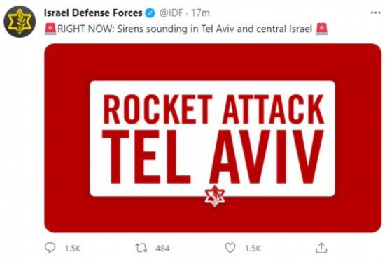 以色列国防部在同一时间在其社交账号上发布消息称,特拉维夫及以色列中部响起防空警报。