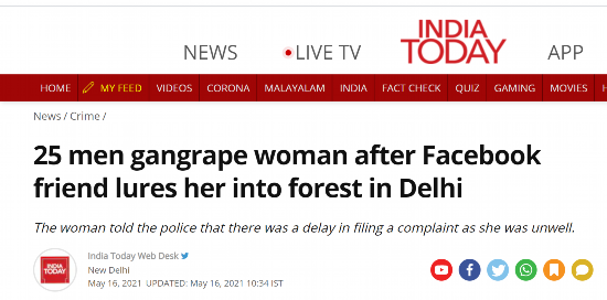 《今日印度》16日报道了这样一起惨案:一名印度女子被脸书上认识的男网友骗去见父母,结果遭25名男子强奸。