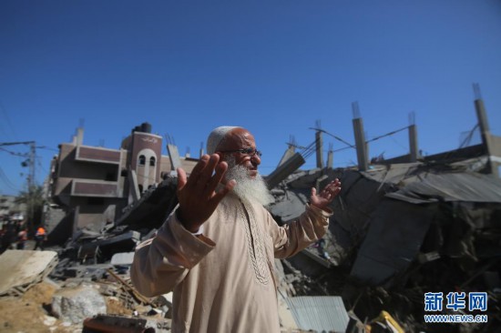 5月16日,一名巴勒斯坦男子在加沙地带拉法查看一栋在以军空袭中被炸毁的房屋。