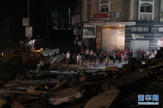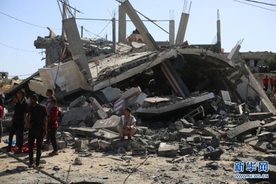 5月16日,巴勒斯坦民众在加沙城查看一栋在以军空袭中被炸毁的房屋。