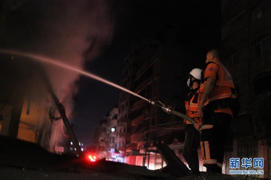 5月16日,巴勒斯坦消防员在加沙城一栋被以军炸毁的房屋处灭火。