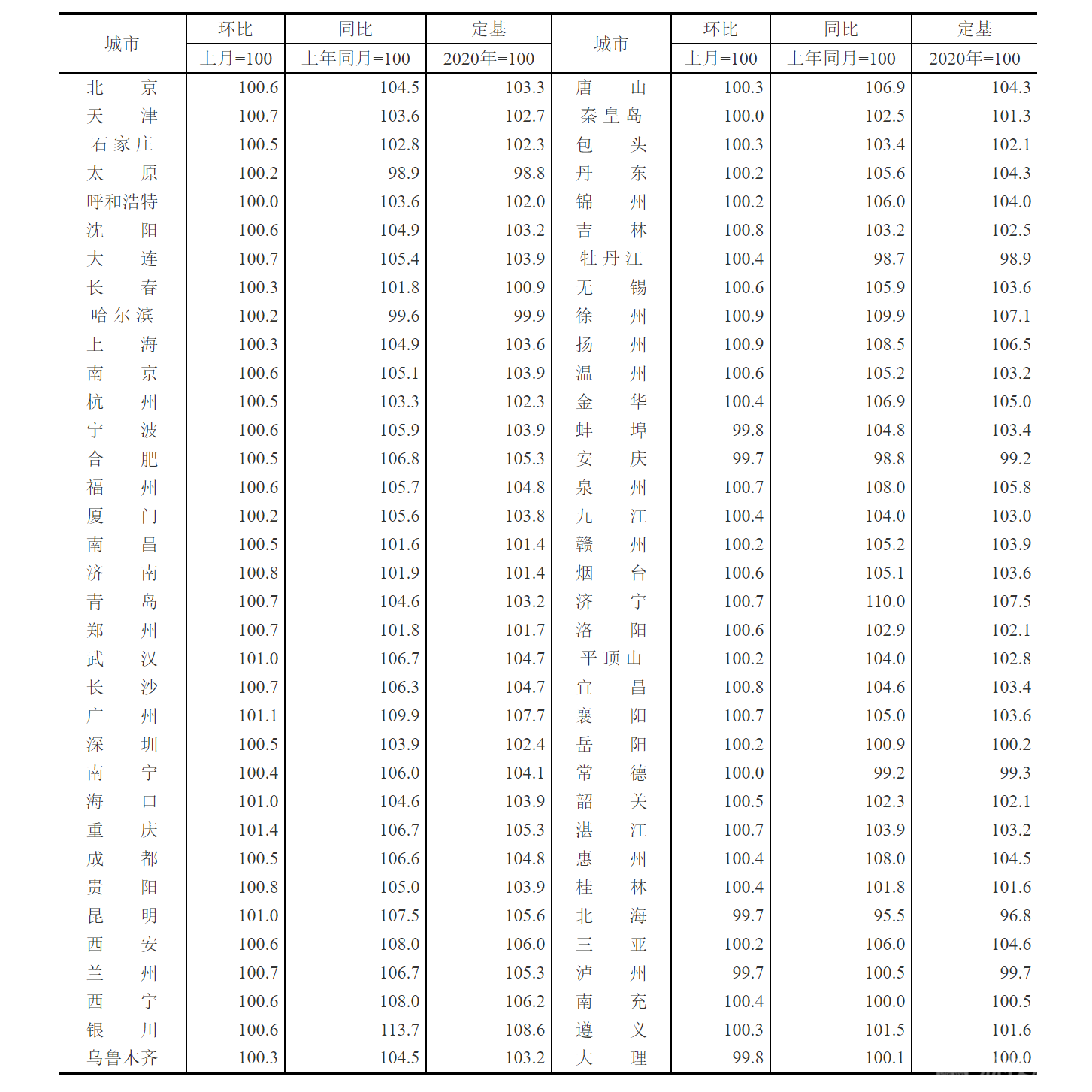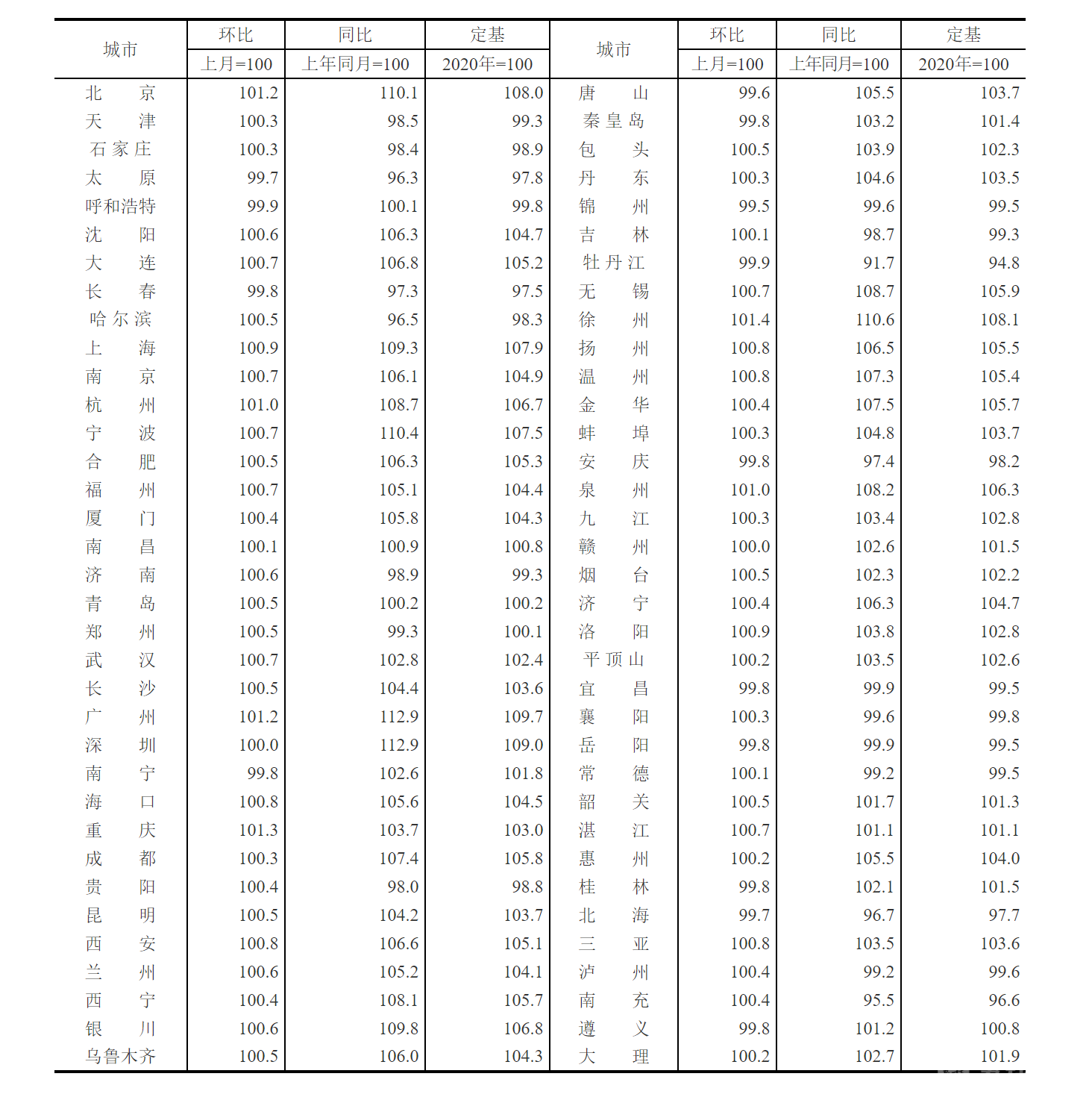 (表1:2021年4月70个大中城市新建商品住宅销售价格指数 图片来源/国家统计局官网)