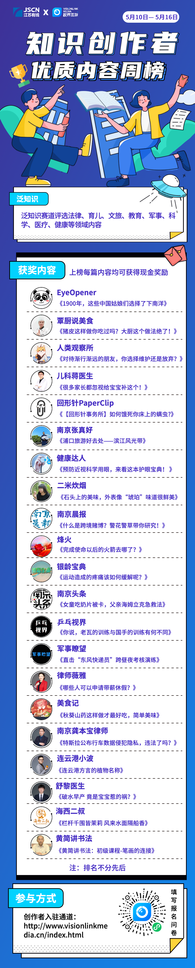 2021年5月17日,视界观【知识创作者集结令】激励计划第六期视频/图文评选获奖名单正式出炉。此名单包括5月10日-5月16日参选的获奖选手及其作品。