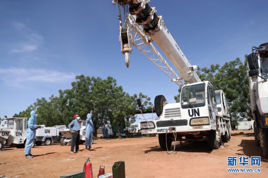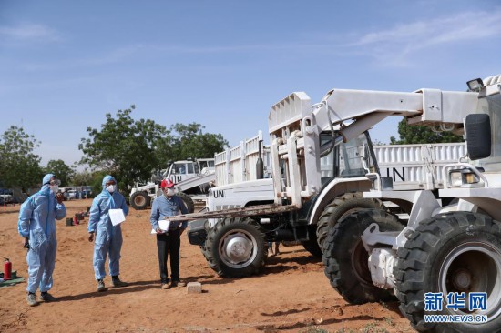 5月16日,在苏丹法希尔,核查组工作人员检查中国第16批赴苏丹达尔富尔维和工兵分队工程机械的性能。