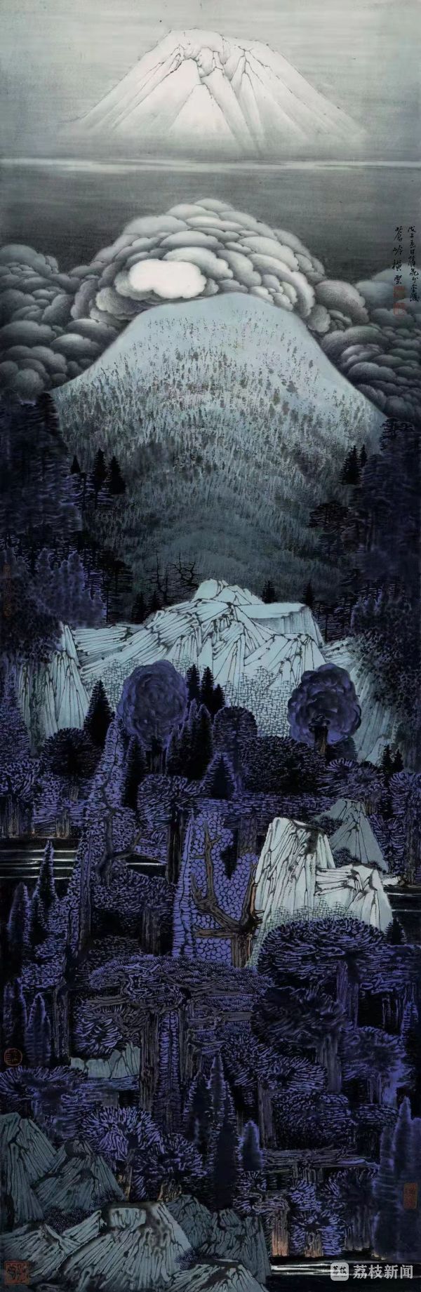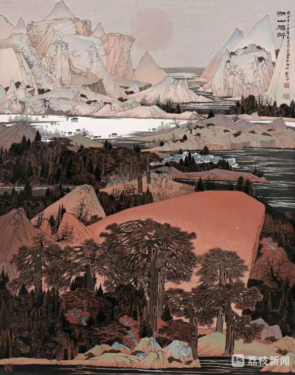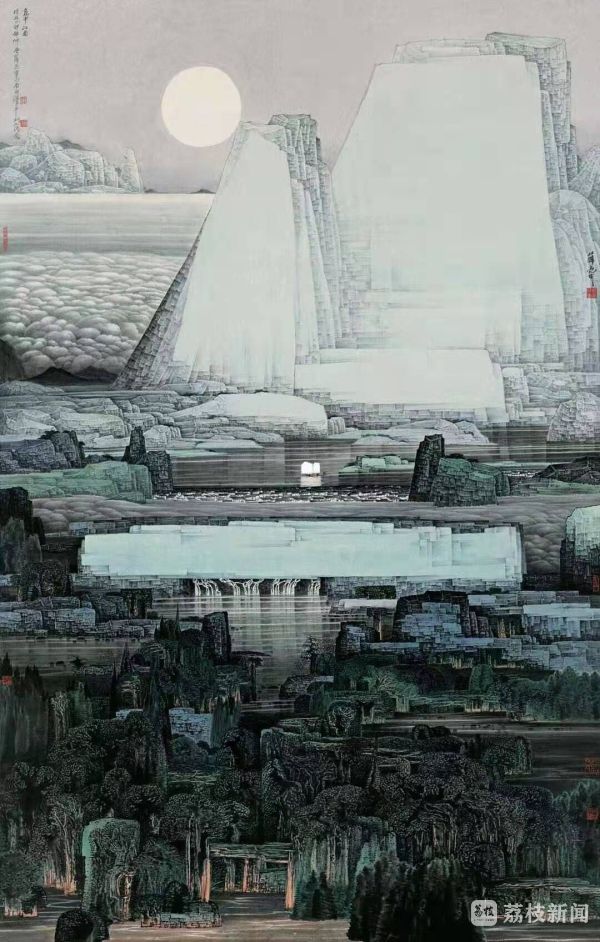 薛亮的山水画,则以恢奇、梦幻、装饰的主观塑造开青绿山水画之新境。他以主观意象进入,造景造境,于形态、色彩、空间等方面另立我法,营造出一种别有世外奇观的山水图像,青峰窅渺,丹霞迤逦,是名震大江南北的薛家山水。