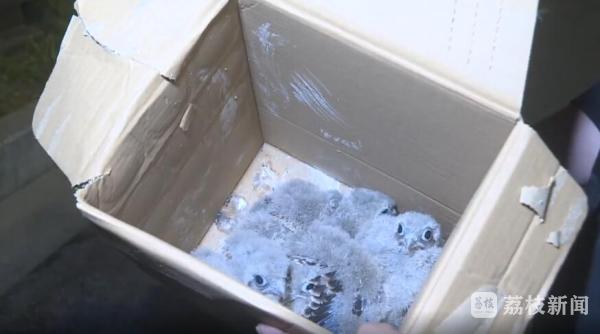 5月16日晚,电力维修工周先生给记者带来一个箱子。箱子里是五只可爱的雏鸟,眼睛大大的,特别招人喜欢。周先生说,这是在泗洪一处高压电塔上意外发现的,看上去有点像隼类,不知道是不是保护动物,所以想拿去鉴定一下。