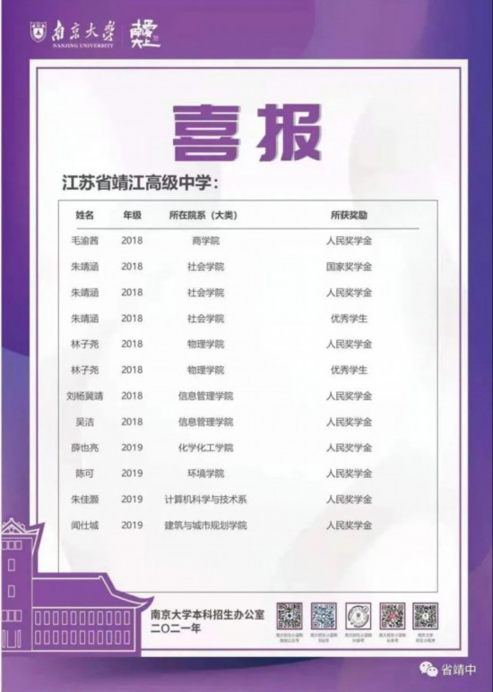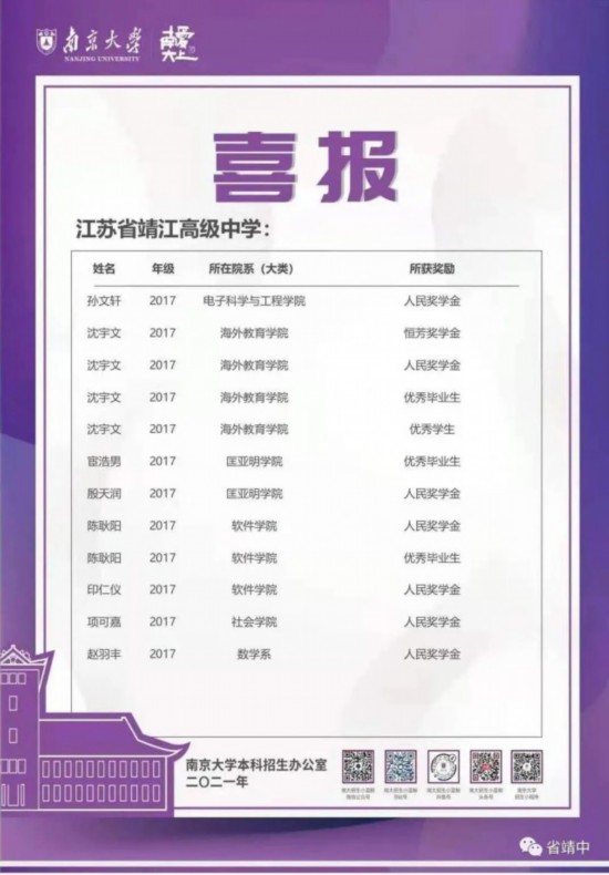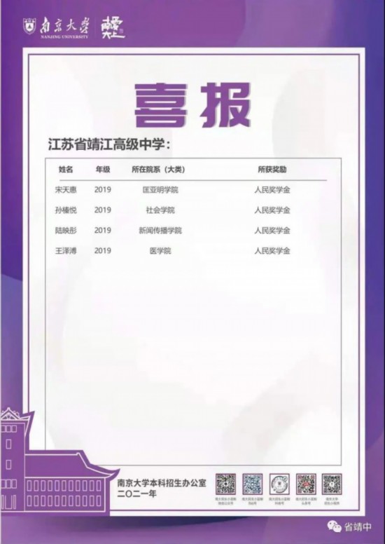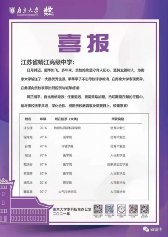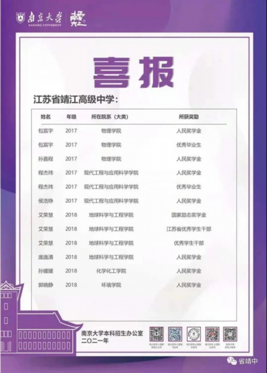其中江苏省靖江高级中学2016届1人、2017届1人、2018届3人、2019届1人分获清华大学2020年度学业优秀奖、社会工作优秀奖、综合优秀奖、“好读书”奖学金、综合优秀奖等奖励;2016届7人、2017届19人、2018届14人、2019届 8人分获南京大学2020年度国家奖学金、优秀毕业生、江苏省优秀学生干部、国家励志奖学金等奖励。