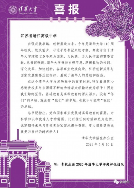 近日,清华大学、南京大学,向江苏省靖江高级中学发来喜报,祝贺该校毕业生在这两所大学2020年评奖评优中获各类表彰,两校对省靖中多年来源源不断地输送优秀生源表示感谢,并期待未来与省靖中更加紧密地携手奋进,着力培养堪当民族复兴重任的时代新人。
