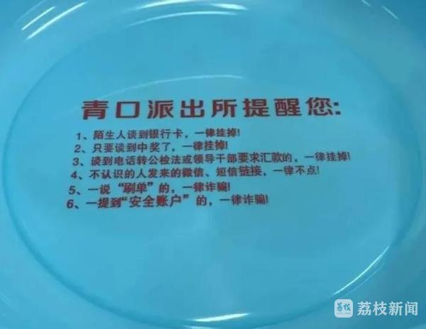 “洪庄派出所提醒您,凡是网上贷款需要先交钱的就是诈骗......”在东海县洪庄镇多家奶茶店,每一位顾客都能非常醒目地看到奶茶杯上印制的“八个凡是、六个一律”反诈标语。据了解,这是东海警方推出的反诈奶茶杯,旨在通过比较生动、形象的防骗标语提醒大家警惕各类网络电信诈骗。