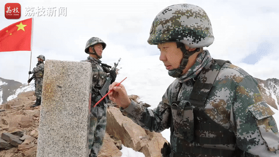 界碑就在眼前,所有人的疲惫都化作了力量,大家冲向界碑,把界碑抱在怀里,好像许久未见的战友。韩白伟一直在北京工作,这次到西北边陲当兵锻炼机会很难得,给界碑描红一直是他的愿望。描红后,大家面向国旗庄严宣誓,铮铮誓言回荡在雪山之巅。