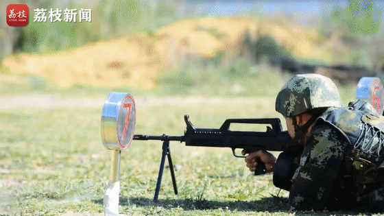 在班用机枪隐现靶运动射击课目中,参训队员每次射击要携带弹药18发,采取“卧姿”,分别在200米、150米、100米射击地线,对半身靶、胸环靶、头靶、进行射击,全程用时2分钟。这个课目要求参训队员在每一个射击地线点射6发,然后快速跃进下一个射击地线进行射击,每次显靶时间均为10秒。队员在快速跃进中要及时调整呼吸和瞄准击发,射击时必须有很好的预判性,只有沉住气稳住神才可能打出好成绩。