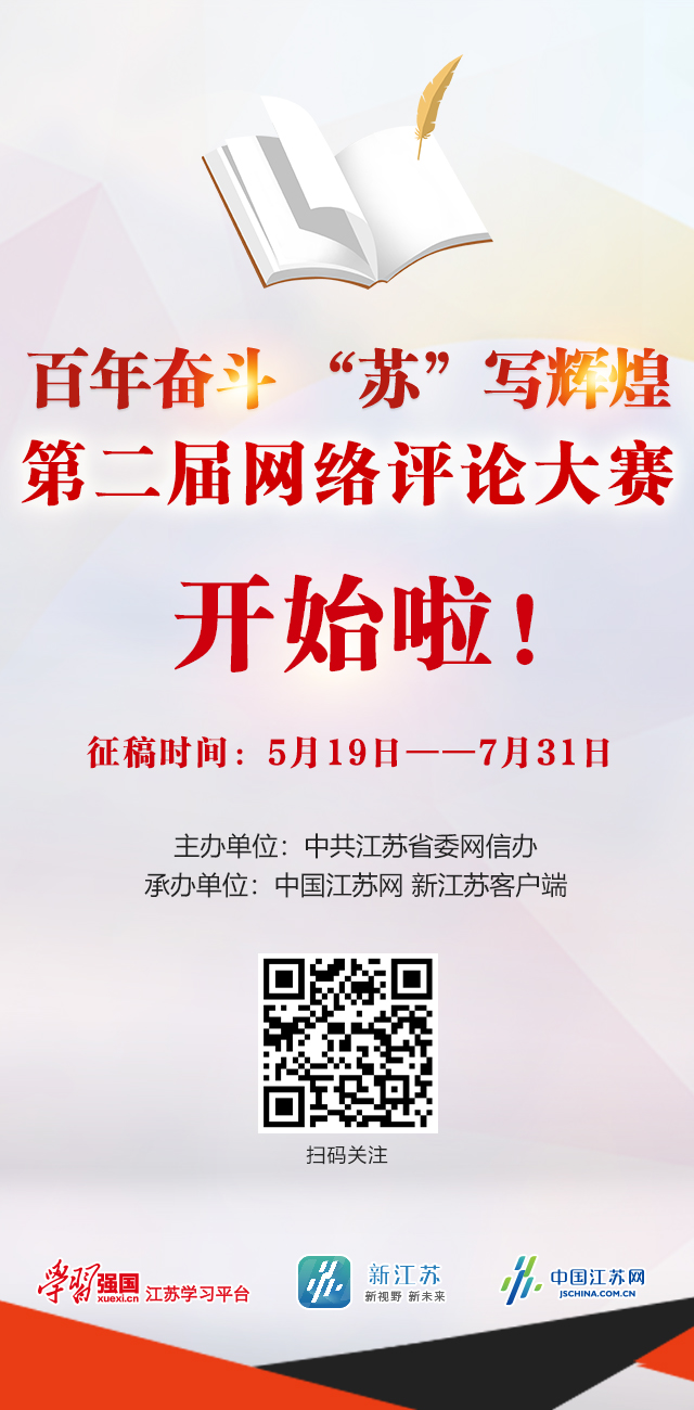 百年峥嵘初心如磐,e心向党历久弥坚。百年党史,一头连着一代代革命先辈的矢志奋斗,一头通向广大人民群众的梦想福祉。100年来,在中国共产党的坚强领导下,江苏改革发展蹄疾步稳、勇毅笃行,取得令人瞩目的伟大成就。为庆祝中国共产党成立100周年,贯彻落实中央和省委关于开展“永远跟党走”群众性主题宣传教育活动部署,由江苏省委网信办主办、中国江苏网承办的“百年奋斗 ‘苏’写辉煌”——第二届网络评论大赛正式启动!