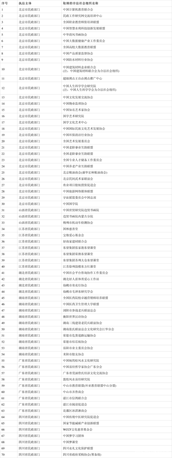 今天(5月19日),民政部公布了第三批地方民政部门近年来依法取缔的部分非法社会组织名单,一共70家。其中江苏省民政厅依法取缔了国林慈善堂、宝缘爱心基金会、好商家建材联合会、东望集团张家港东望课堂、东望集团常熟东望课堂、东望集团苏州太仓东望课堂、江苏徐州鼓楼东方红课堂7家非法社会组织。