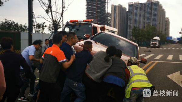 原来,消防员们在训练过程中,发现营区外突发一起交通事故,一辆红色轿车撞倒了一辆电瓶车,骑电瓶车的一名女子被压在车下,还有一名5岁左右的男孩摔倒在路边。消防员们跑到现场后,立即拨打110和120,并与周围群众一起展开救援。