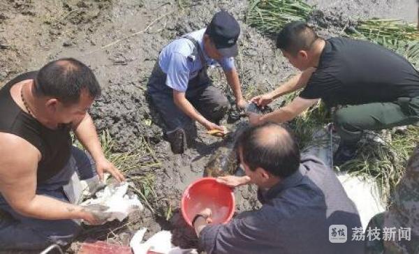 警方通报,此前,宝应县望直港镇望马路临近集镇东侧的河沟里,工人在清淤河道时冲出了一个黑乎乎的“铁疙瘩”,疑似炸弹。接到报警后,宝应县公安局望直港派出所火速组织民警赶赴现场,经过查看发现,“铁疙瘩”可能是一枚航空炸弹。民警立即要求停止施工作业,并迅速划定警戒区域,安排警力对外警戒、疏散群众,同时向县公安局、县政府报告。