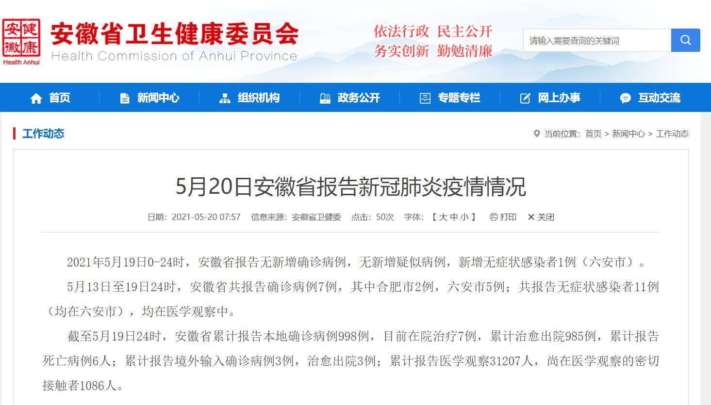 荔枝新闻讯 据安徽省卫健委网站消息,2021年5月19日0-24时,安徽省报告无新增确诊病例,无新增疑似病例,新增无症状感染者1例(六安市)。