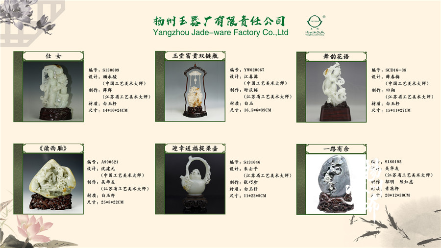 “我们希望借助此次展会亮相契机,向世界展示‘扬州工’的风采。”相关工作人员介绍,在线上云展馆进行展销的有扬州漆器厂的雕漆嵌玉《花开呈祥共竞芳》台屏、纯雕漆《福寿双全》葫芦摆件、点螺楠木雕《醉翁亭》漆砂砚等,扬州玉器厂的《仕女》《舞韵花语》《读西厢》等。