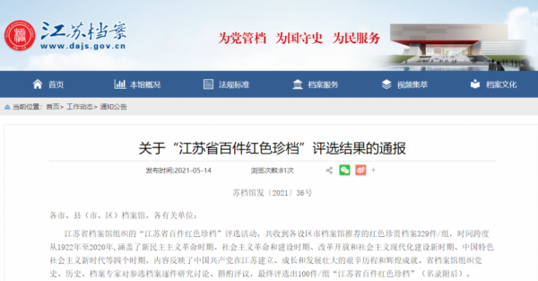 近日,江苏省档案馆发布了关于“江苏省百件红色珍档”评选结果的通报。