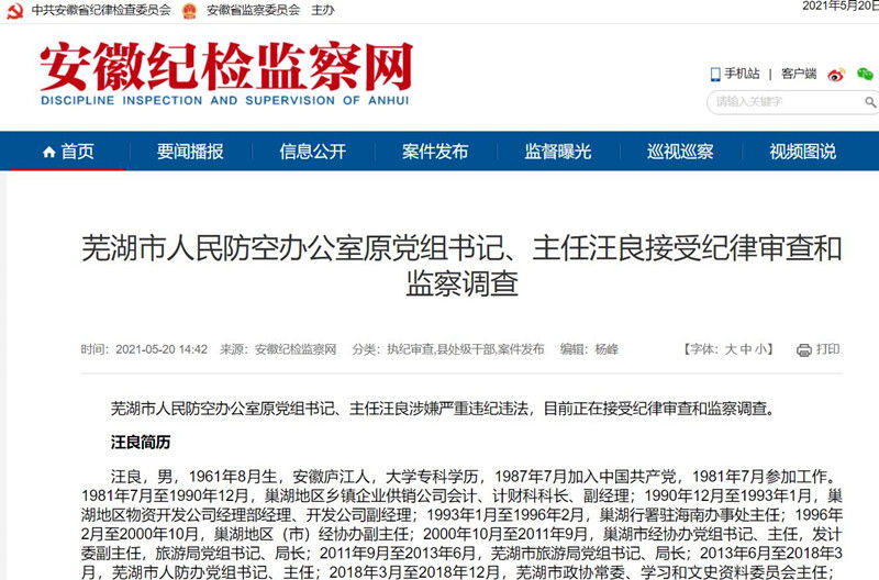 荔枝新闻讯 据安徽纪检监察网站消息,芜湖市人民防空办公室原党组书记、主任汪良涉嫌严重违纪违法,目前正在接受纪律审查和监察调查。