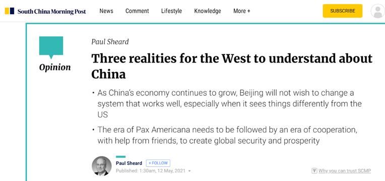 【环球网报道】香港《南华早报》5月12日刊发美国哈佛大学肯尼迪政府学院研究员保罗·谢尔德的文章,题为“西方应了解中国的三个现实”。文章称,世界的命运将在很大程度上受到未来几年和几十年里中美关系状况的影响。文章建议中美两国加强合作,共同解决全球性问题。