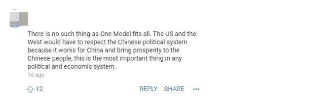 一位网友评论说:“没有一种万能的模式。美国和西方必须尊重中国的政治制度,因为它适合中国,为中国人民带来了繁荣,这对任何政治经济体制来说都是最重要的事。”↓