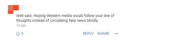 还有网友表示,“说得好。希望西方媒体能学习你的思路,而不是盲目地散布假新闻。”↓