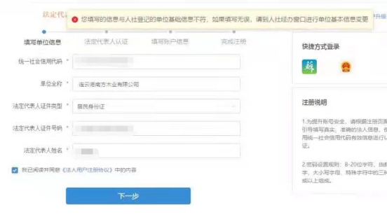 二、单位注册时,提示“您填写的信息与人社登记的单位基础信息不符”如何办理?