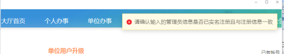 六、单位注册时,提示“请确认输入的管理员信息是否已实名注册且与注册信息一致”如何办理?