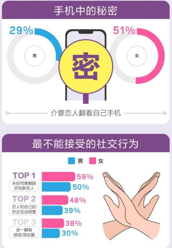 报告显示,“未经同意删除异性联系人”“恋人和自己的好友互动频繁”“逐一翻看微信/朋友圈”,占据了最不能接受恋人社交行为排行榜的Top3。
