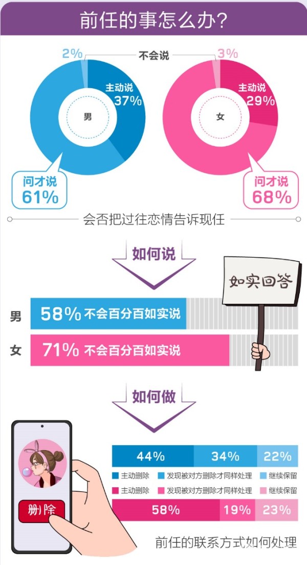 虽然人们主动坦白“前任”的事情,但并不代表着毫无保留交代一切。报告显示,58%的男性与71%的女性即便选择坦诚相待,也并不会百分百如实回答。