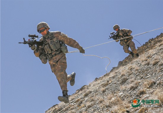侦察兵沿陡坡滑降。