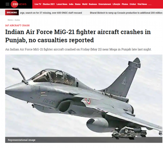 印度“Zee News”新闻网刚刚消息称,当地时间5月21日凌晨,印度空军一架米格-21战斗机在旁遮普邦莫加地区附近坠毁,目前没有伤亡报告。