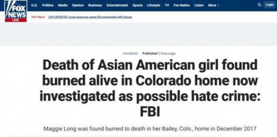 据美国福克斯新闻网20日报道,3年半前,一名17岁的亚裔美国女子被发现死在其位于科罗拉多州贝利(Bailey)被烧毁的自家房子中,这起案件至今还未破案,目前美国联邦调查局(FBI)正在调查此案是否与仇恨犯罪有关。