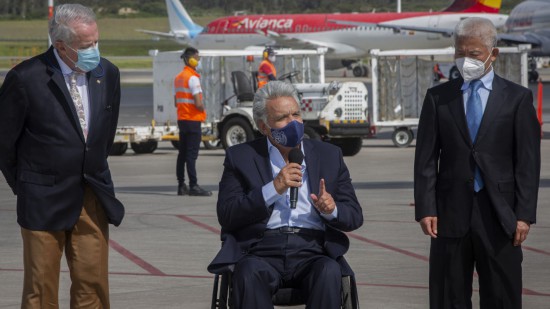 4月7日,厄瓜多尔政府采购的首批由中国科兴公司生产的新冠疫苗运抵厄首都基多,厄总统莫雷诺(中)在疫苗接收现场讲话。新华社发(圣地亚哥·阿马斯摄)