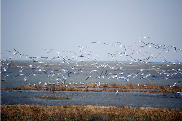 记者站在湖边,只见一只健硕的头雁,张开翅膀风一般飞过;不远处的湿地里,黑翅长脚鹬、大雁等鸟类正在悠闲地舒展身躯。工作人员介绍,这里有丰富的嫩草、狗尾草、金鱼藻等200多种野生、水生植物的种籽和果实,是它们享用不尽的“谷仓”。