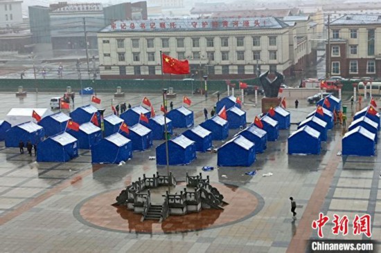 图为玛多县城搭建的救灾帐篷。 郭紫阳 摄