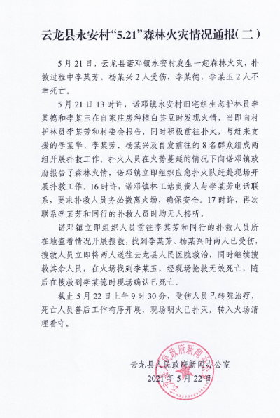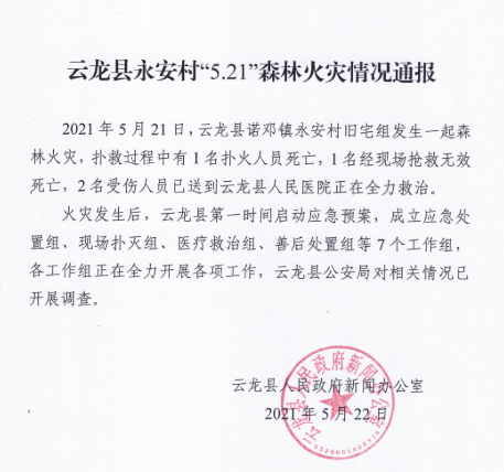 5月22日,记者从云南省大理州云龙县人民政府新闻办公室获悉,21日,大理州云龙县诺邓镇永安村旧宅组发生一起森林火灾,扑救过程中,因火势较大,1名扑火人员死亡,1名经现场抢救无效死亡,2名受伤人员已送到云龙县人民医院全力救治,目前,现场明火已扑灭,转入火场清理看守。