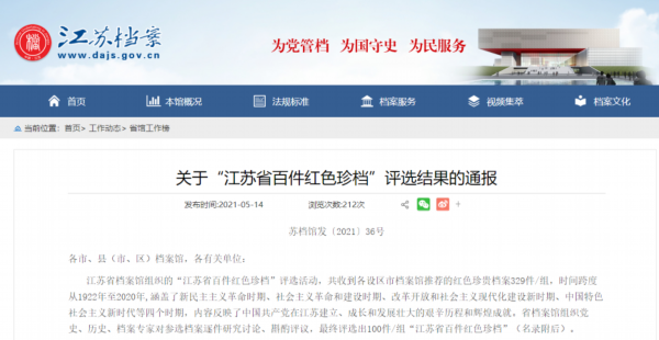 近日,省档案馆发布“江苏省百件红色珍档”评选结果。